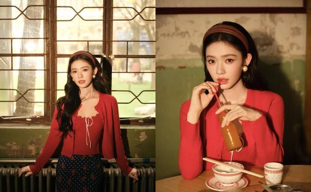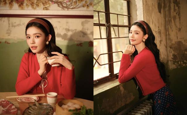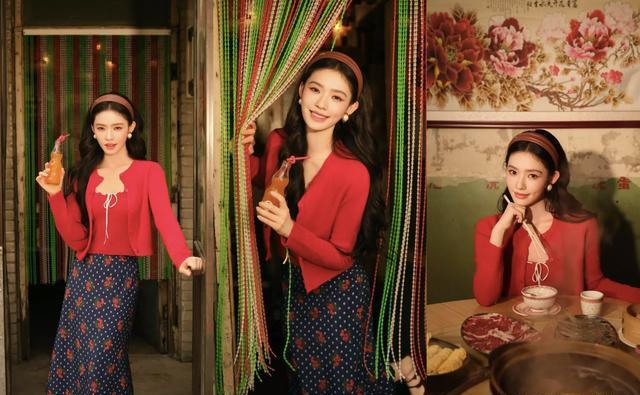 这组大片并非单纯时尚拍摄,而是为新剧《冬去春来》的“追剧团”宣传所打造。林允在剧中饰演女主角“沈冉冉”,一位经历时代变迁、情感跌宕的女性角色。从造型到氛围,剧组与林允团队高度还原了角色所处年代的视觉质感——红色针织衫、波点裙、珍珠耳环、卷发造型,甚至连手持的玻璃瓶饮料、桌上热气腾腾的火锅、墙上的“富贵花开”年画,都精准复刻了90年代市井生活的烟火气。