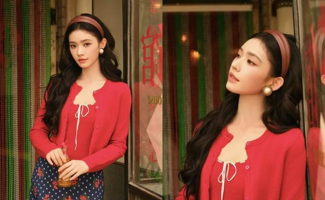 2026年3月25日,演员林允一组“年代感大片”在社交平台刷屏。照片中,她身穿红色针织开衫搭配深蓝波点长裙,头戴棕色发带,手持玻璃瓶饮料或茶杯,置身于老式窗棂、珠帘门、复古墙纸与火锅桌前,暖调光影下,仿佛从90年代港片中走出的“红衣少女”,瞬间点燃网友怀旧情绪。